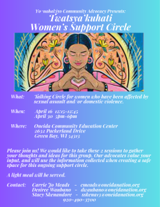Mission statement: The Oneida Nation Coordinated Community Response Team is dedicated to addressing domestic violence, and sexual assault through a multijurisdictional approach rooted in traditional Native Values. Our purpose is to improve the safety of all victims and their families, provide community education, facilitate healing, and hold people that cause harm accountable.