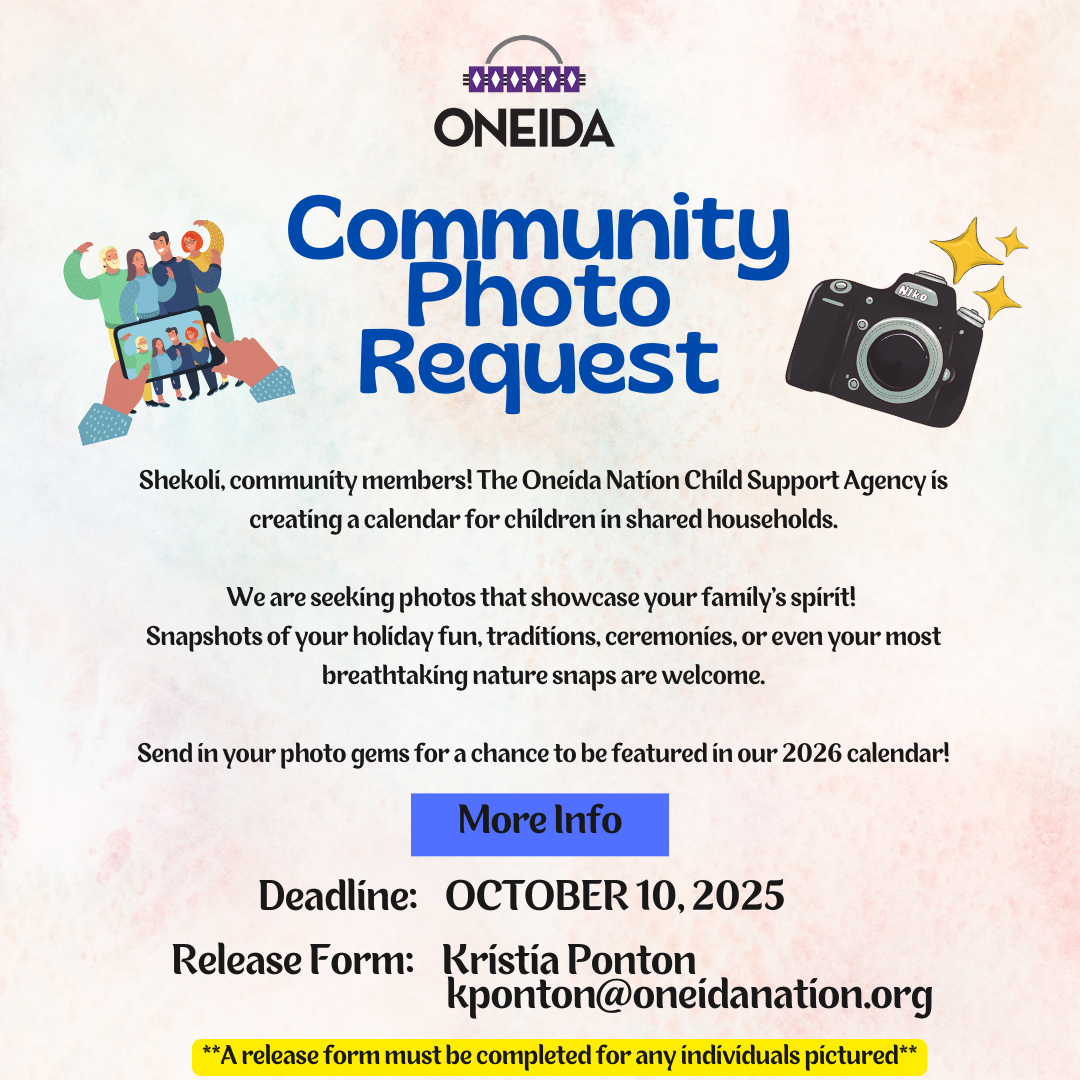 ONCSA Photo Request: We are seeking photos to add to our 2026 calendar for children in shared households- Family photos, outings at the zoo, park, or even just your best nature photos! Please email kponton@oneidanation.org for a release form (any individual pictured will need a form). Yaw^ko!