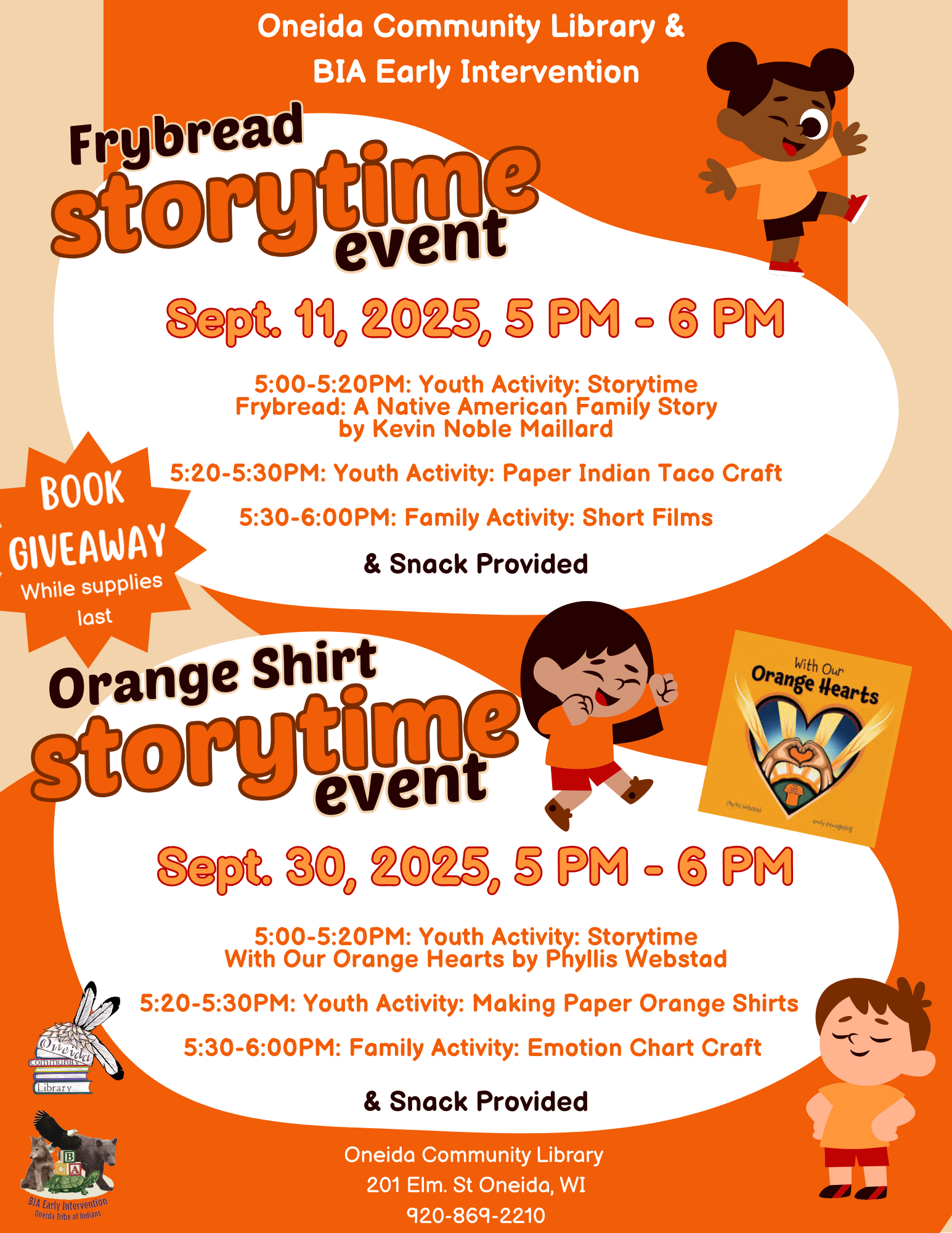 Get ready for October Programming at the Oneida Community Library! But don’t forget about the Orange Shirt Storytime Event on Tuesday, Sept. 30 from 5pm-6pm. Book Giveaway while supplies last. Let’s make some orange shirt crafts!