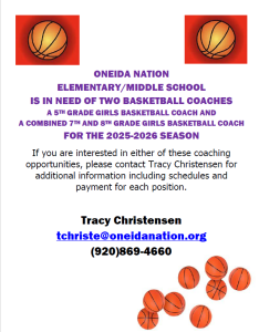 ONEIDA NATION ELEMENTARY/MIDDLE SCHOOL IS IN NEED OF TWO BASKETBALL COACHES Posted on Oct 30, 2025 by Jennifer School Featured Share Article