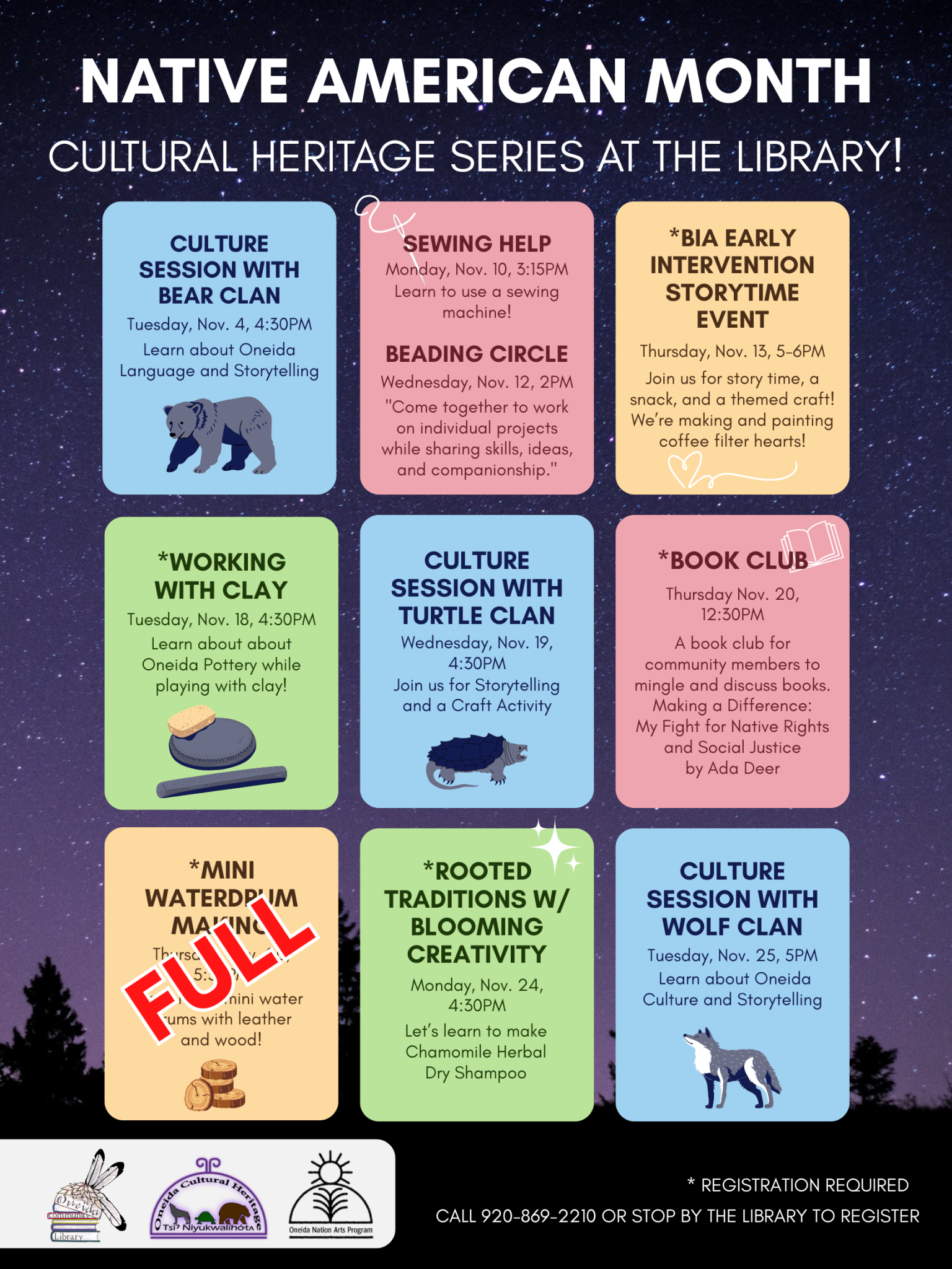 The Oneida Community Library still has openings for registration. The Akwelyá·ne Storytime Event on Thursday, Nov. 13 from 5pm-6pm. Working With Clay is on Tuesday, Nov.18 at 4:30pm-5:30pm. Rooted Traditions with Blooming Creativity only has 1 spot left!