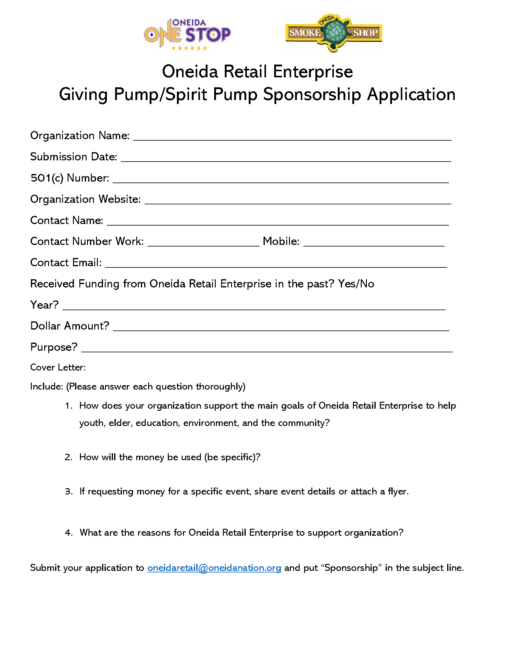 TODAY IS THE FINAL DAY to submit your application for the Oneida Giving/Spirit Pump program for 2026. Organizations must be a non-profit. Applications can be sent to oneidaretail@oneidanation.org or contact Phil Wisneski at pwisnesk@oneidanation.org for more information.