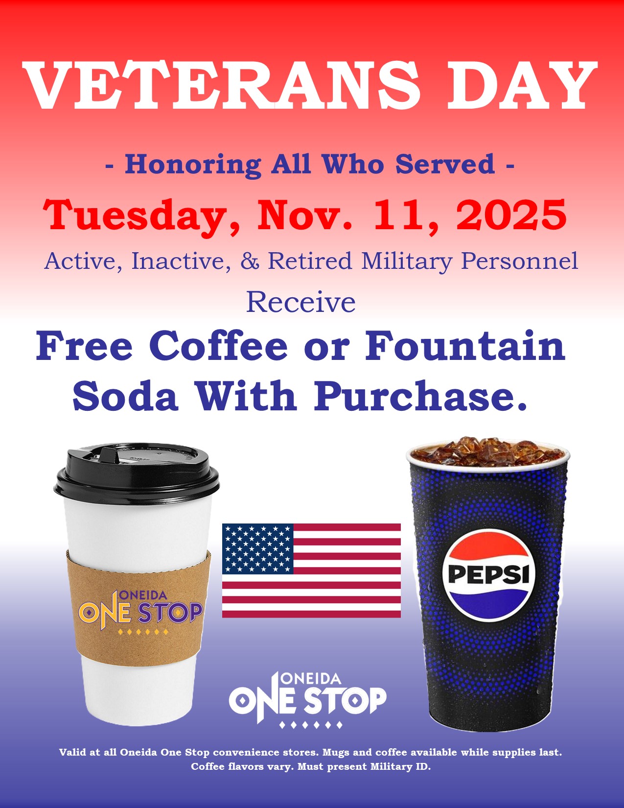 Oneida One Stops would like to thank all those that served our Nation with a free coffee or soda with any purchase on November 11. See flyer for more information.