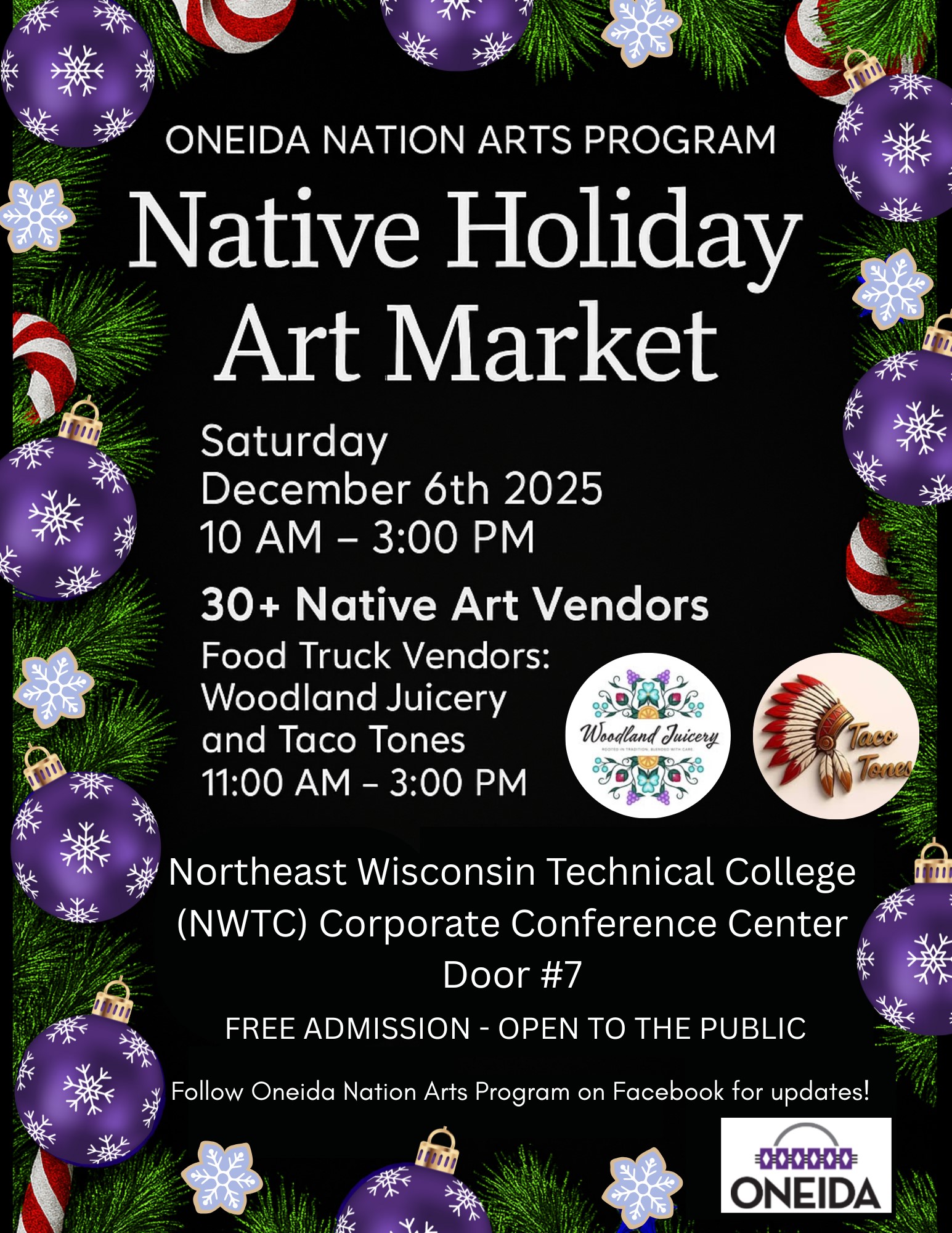 Please see the Oneida Nation Art Program Art Market flyer! December 6th, 10am – 3pm