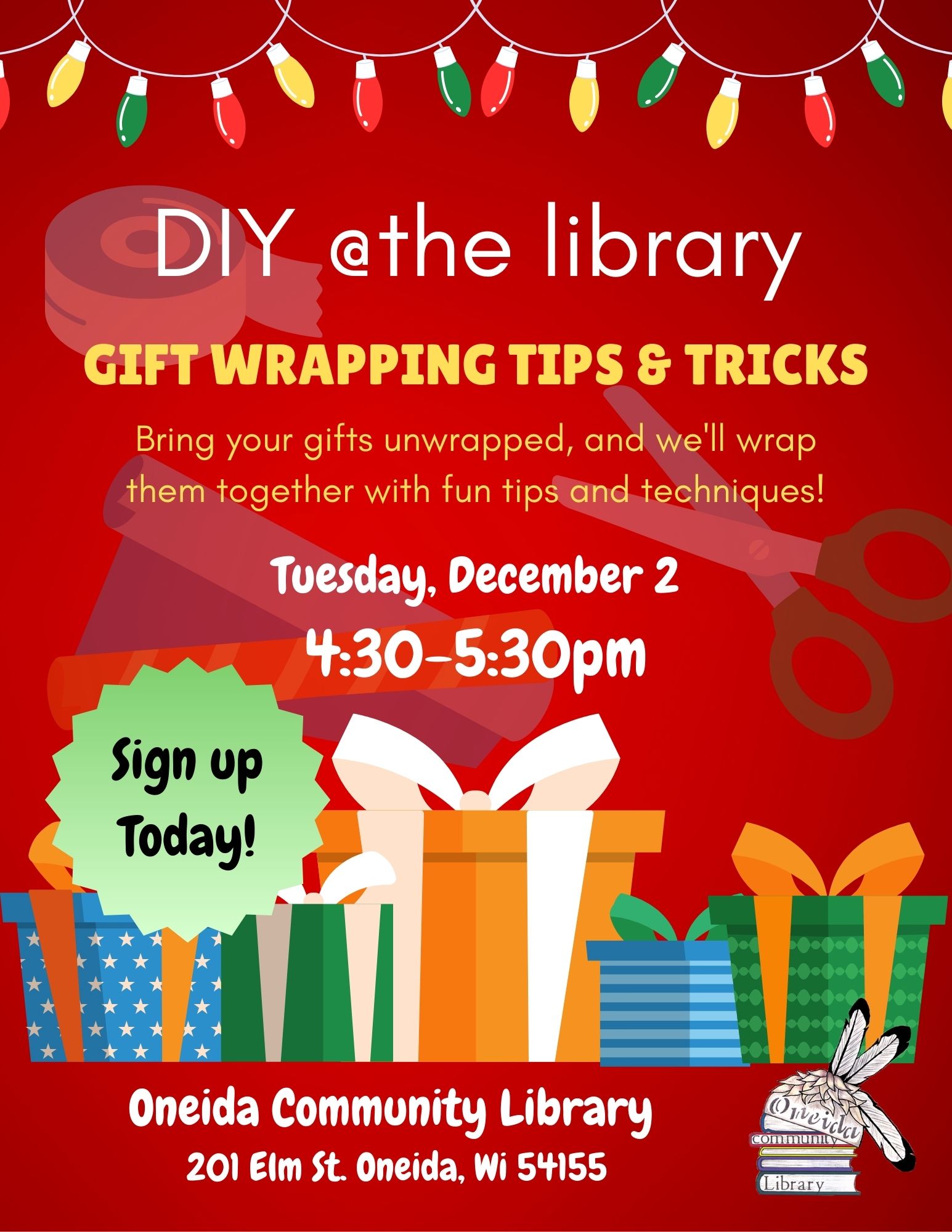 Join us for Mindful Aging at the Oneida Community Library! Check out DIY @ The Library! We’ll be practicing Gift Wrapping Tips & Tricks on Tuesday, December 2 from 4:30-5:30pm.