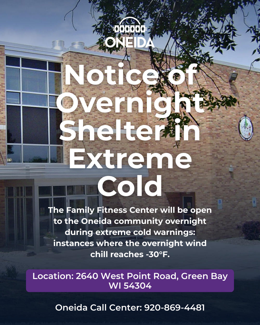 Due to the projected bitter cold, the Oneida Nation will open an Overnight Emergency Shelter this Sunday, January 18, 2026.