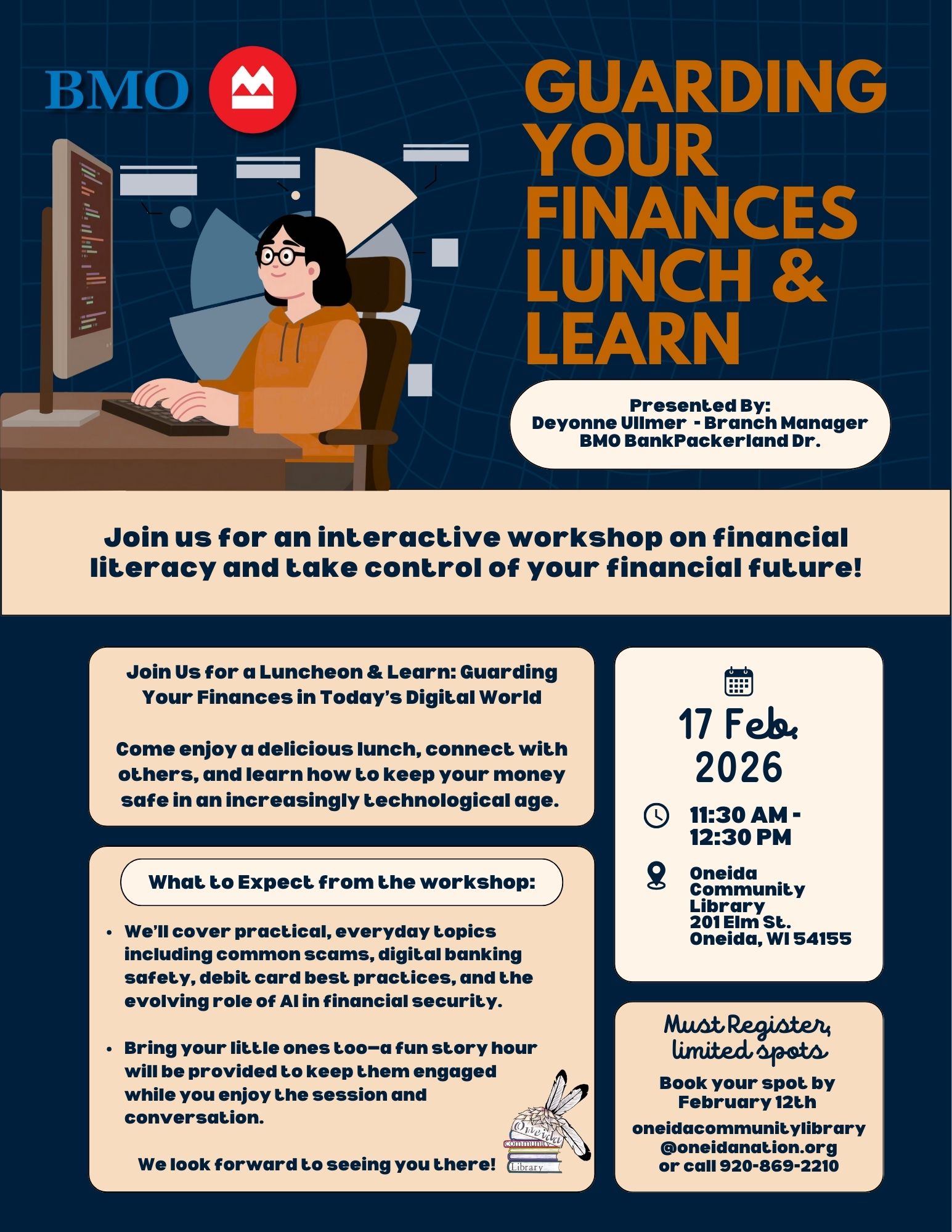 We’ve got some new programming lined up for you at the Oneida Community Library for Library Lover’s Month! Register now for a Luncheon & Learn: Guarding Your Finances in Today’s Digital World by calling us at 920-869-2210 or come in and ask our staff at the front desk.