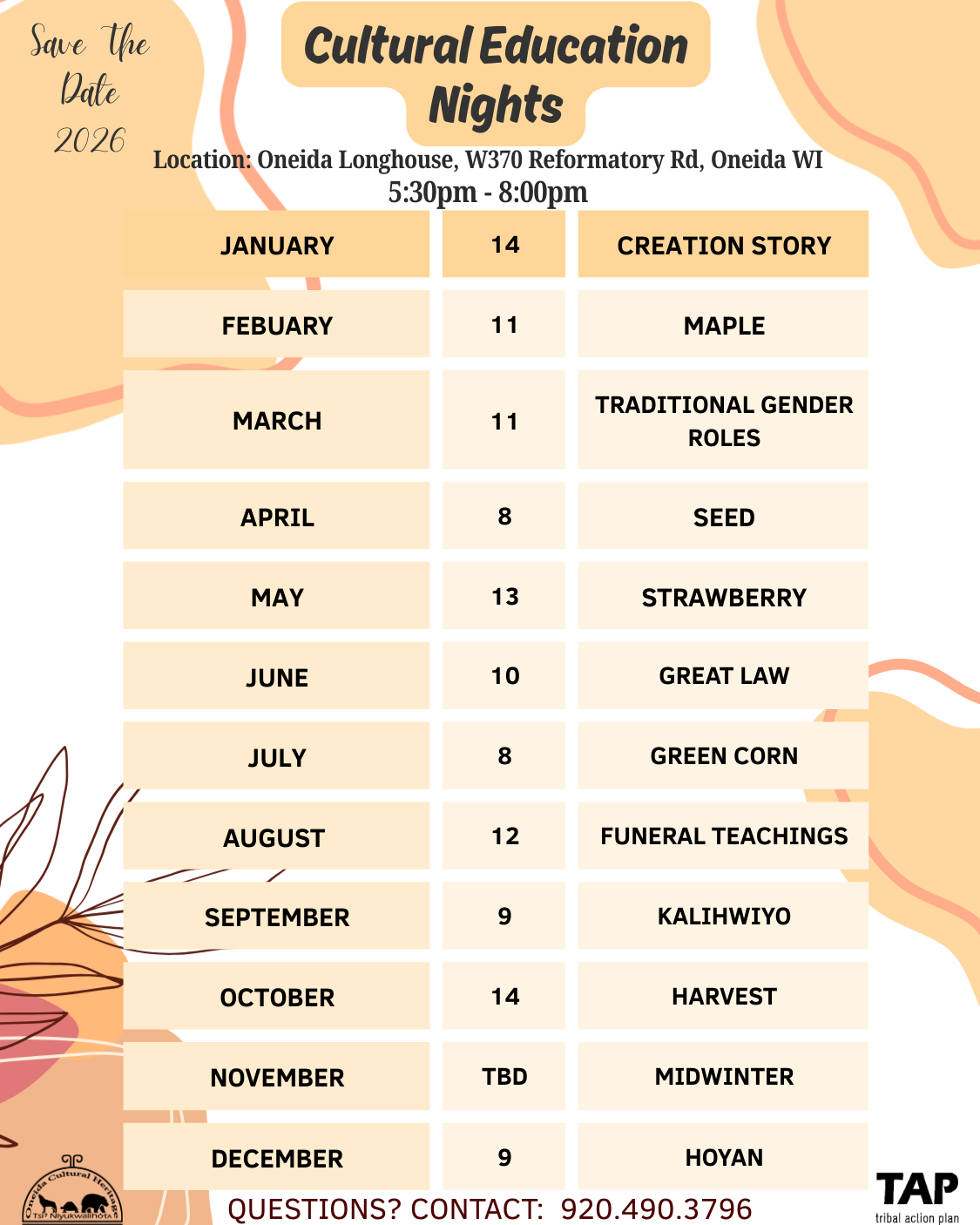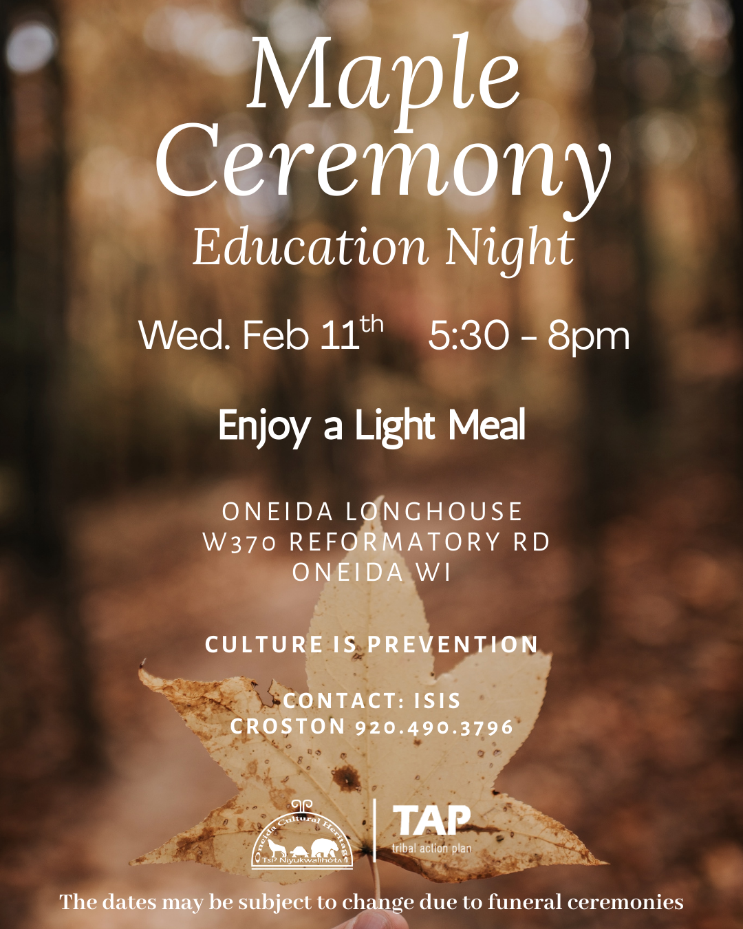 See the flyers for the Maple Ceremony and Cultural Education Night from Oneida Cultural Heritage.