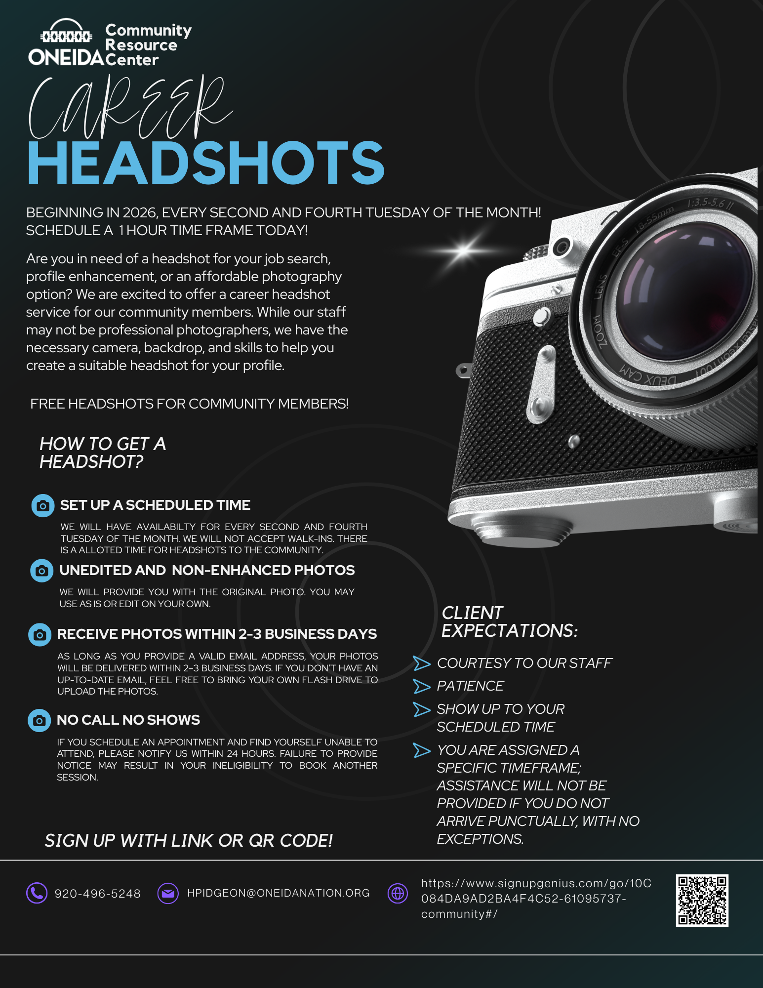 Did you know the CRC now offers headshots? We have a backdrop, camera, and lighting that is similar to ones you can find in a professional studio! Enhance your portfolio, use for job searches, your linked in profile, website, or however you choose! We are also open to schedule sessions for your department and staff. Use link to sign up for a time slot or reach out via email! https://www.signupgenius.com/go/10C084DA9AD2BA4F4C52-61095737-community#/ or hpidgeon@oneidanation.org