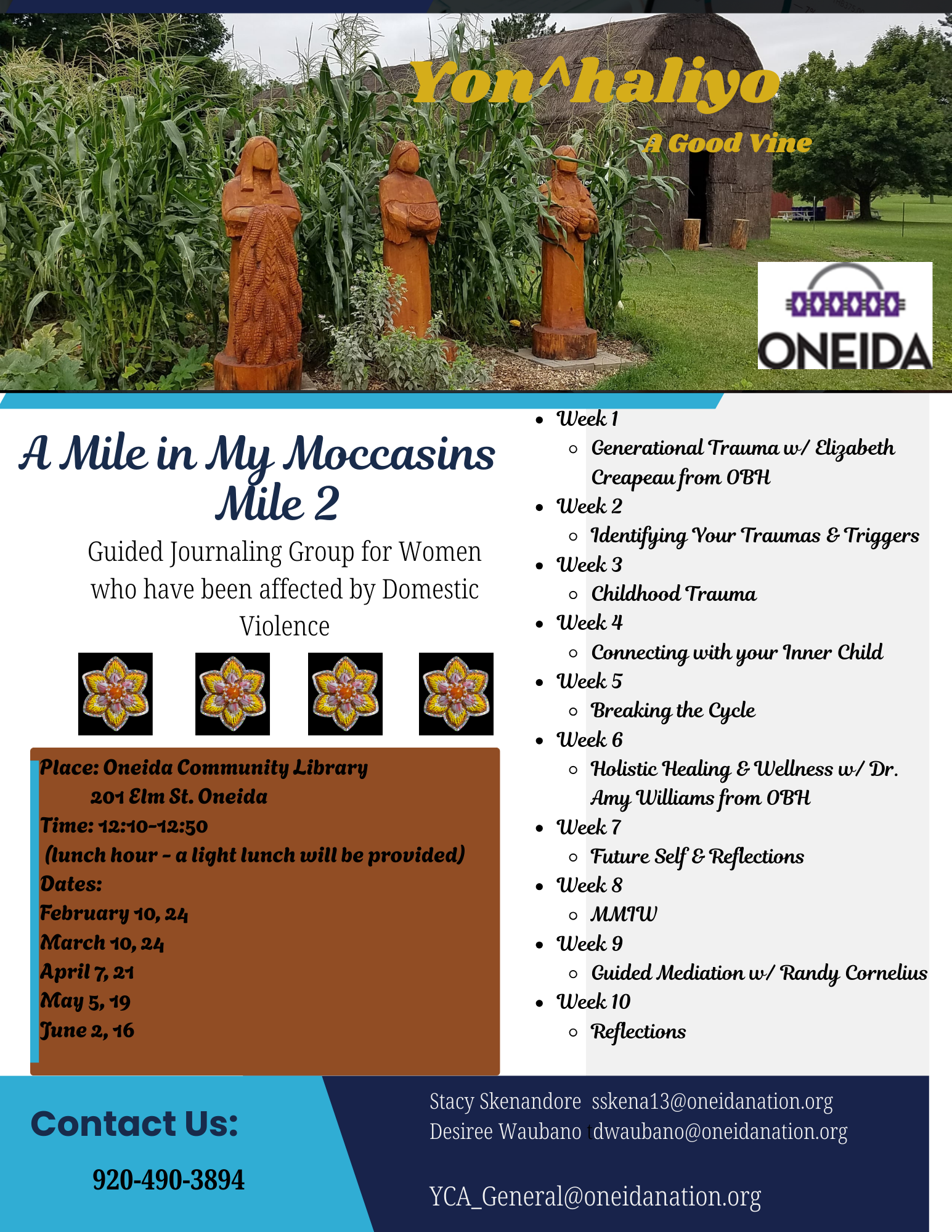 Yon^haliyo is on to Mile 2! Mile in My Moccasins Guided Journaling group is back in session beginning Tuesday, February 10. We look forward to diving deeper into your healing journey. Please come connect with others who have been affected by Domestic Violence. Our first session will cover a brief overview of generational trauma with Elizabeth Creapeau, Psychotherapist at Oneida Behavioral Health.