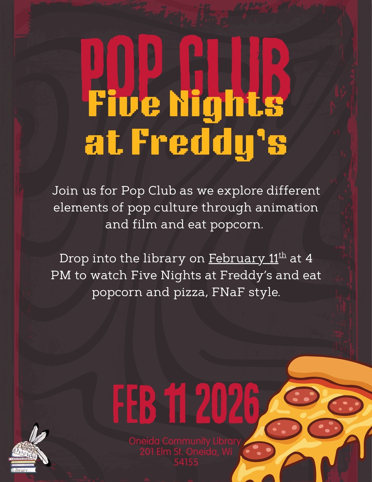 Join us for Pop Club at the Oneida Community Library as we explore different elements of pop culture through animation and film and eat popcorn. Drop into the library on February 11th at 4 PM to watch Five Nights at Freddy’s and eat popcorn and pizza, FNaF style.