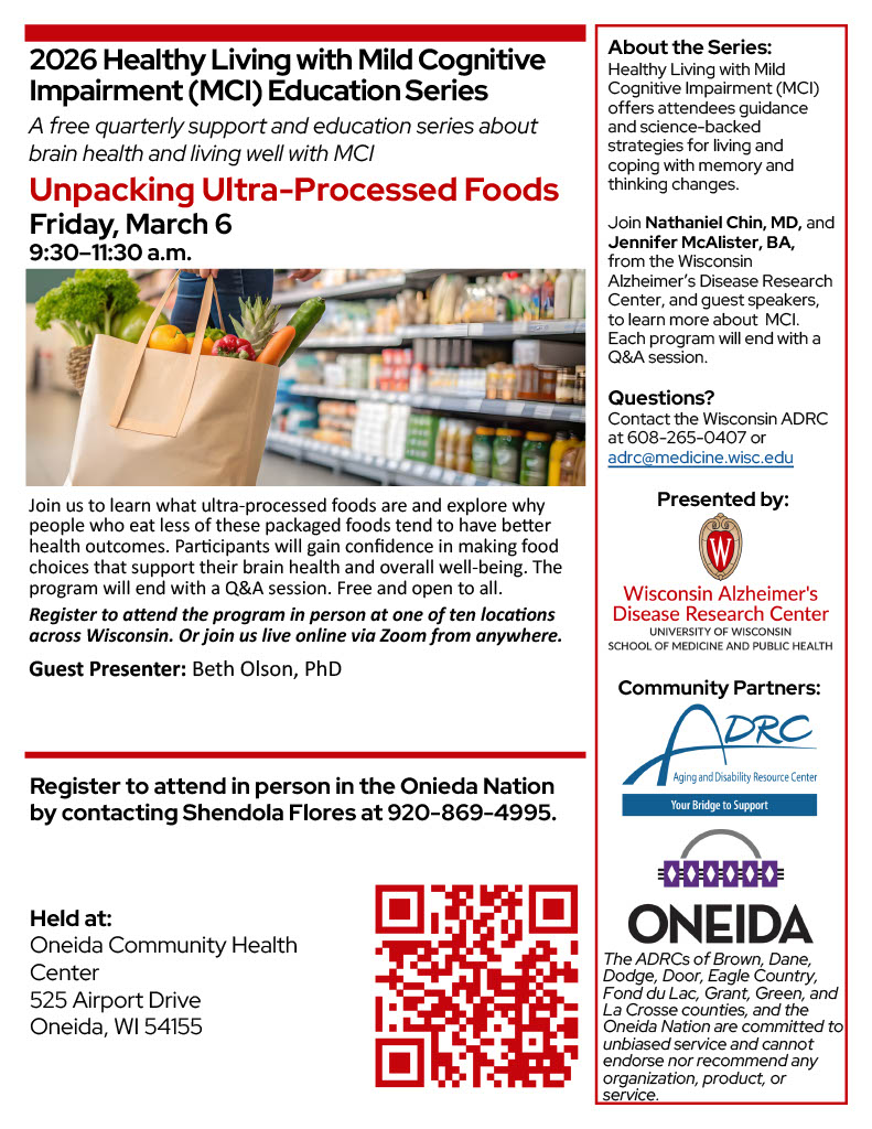 March 6th– 9:30am-11:30am- Join us to learn what ultra-processed foods are and explore why people who eat less of these packaged foods tend to have better health outcomes. Participants will gain confidence in making food choices that support their brain health and overall well-being. The program will end with a Q&A session. Free and open to all. Please contact Shendola Flores to register at 920-869-4995.