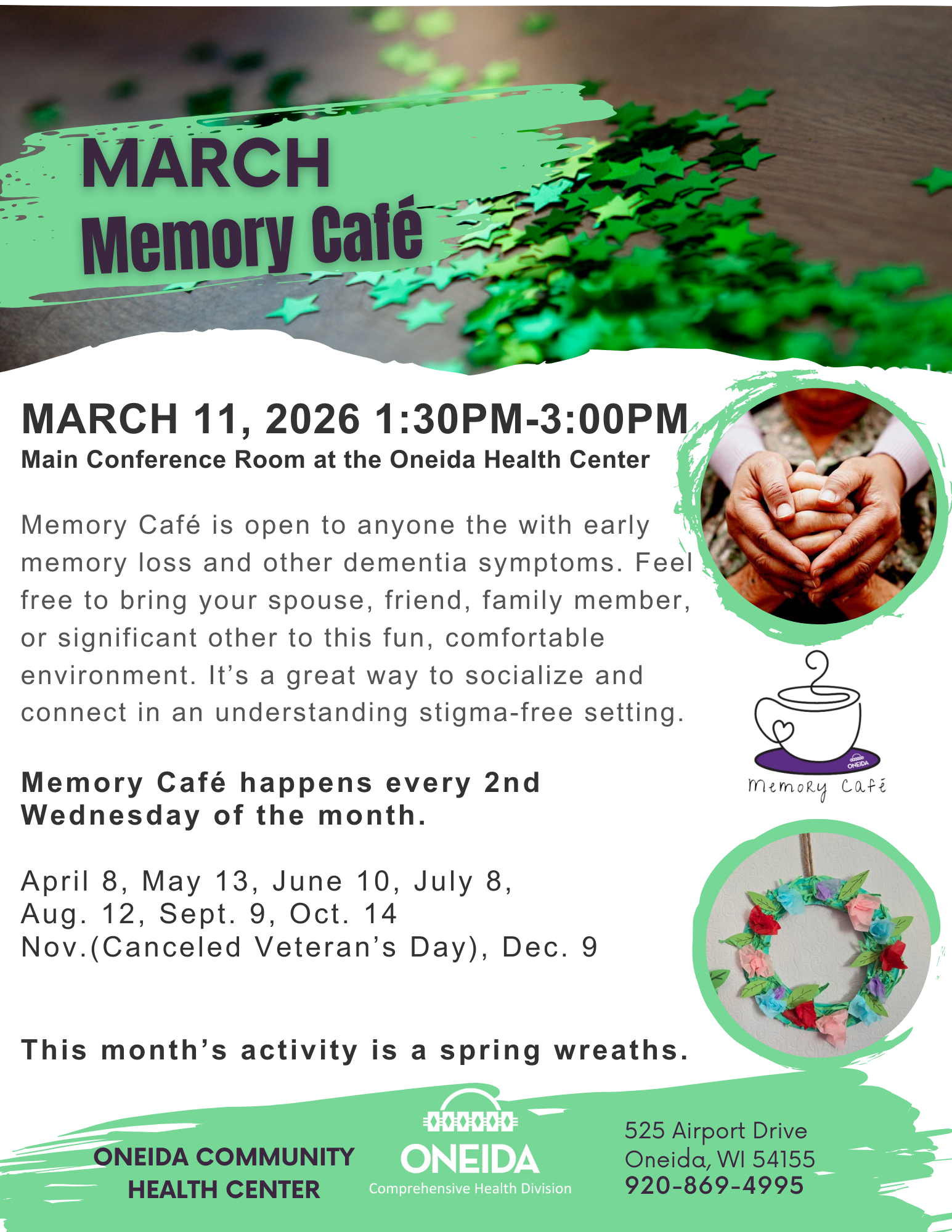 March 11th from 1:30pm-3:00pm located at Oneida Community Health Center- Memory Café is open to anyone the with early memory loss and other dementia symptoms. Feel free to bring your spouse, friend, family member, or significant other to this fun, comfortable environment. It’s a great way to socialize and connect in an understanding stigma-free setting. Please contact Shendola Flores with any questions at 920-869-4995.