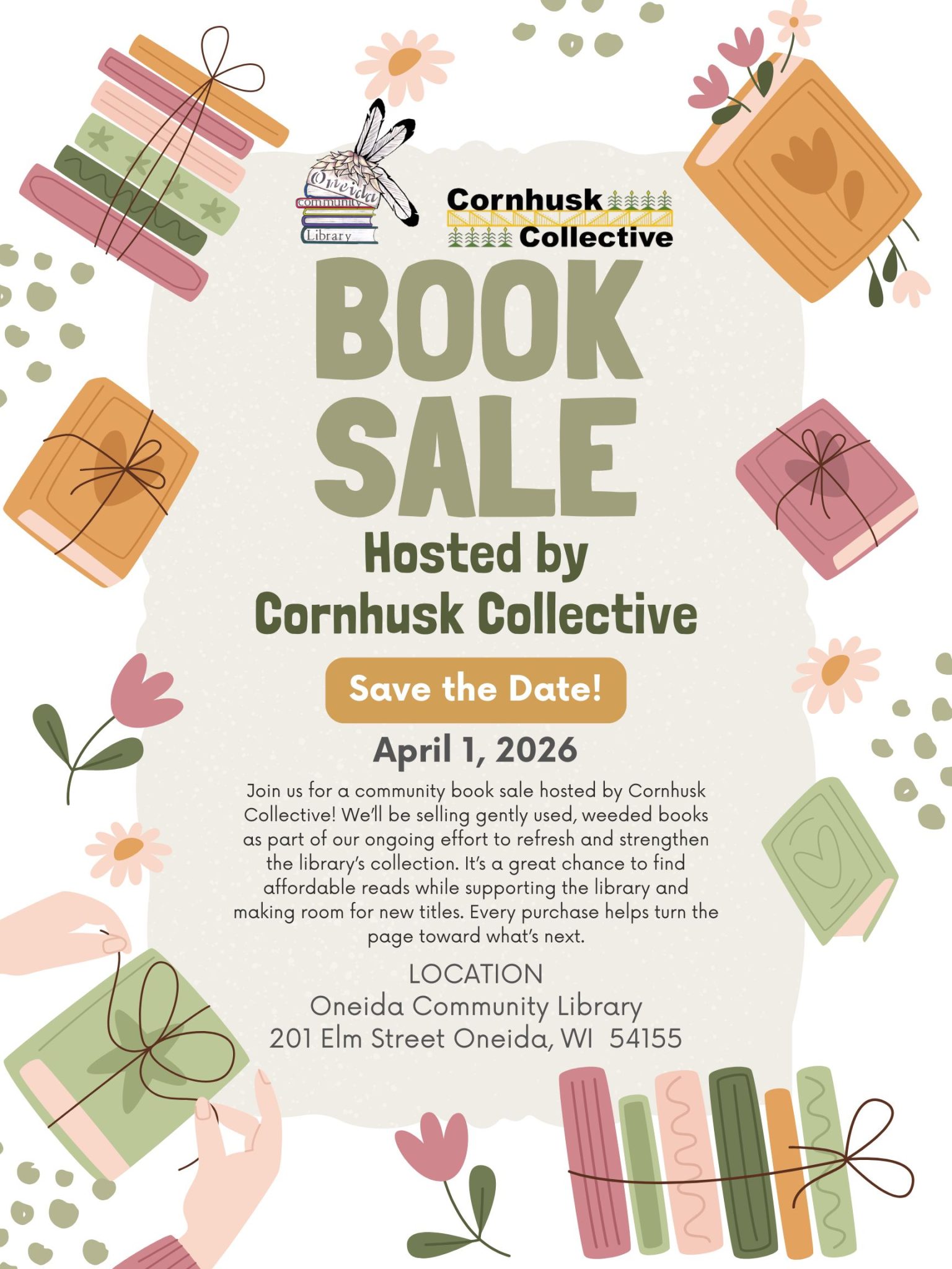 This is not an April Fool’s Joke! The Cornhusk Collective will be hosting a Book Sale at the Oneida Community Library on April 1st! Save the Date! We’ll be announcing the time as we get closer to the day! Every purchase helps turn the page toward what’s next.