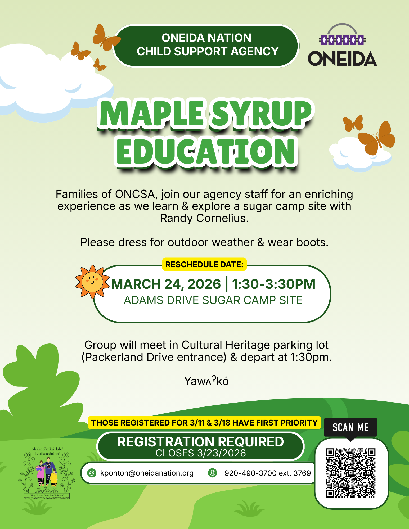 Maple Syrup Education- Register by scanning the QR code, leaving an email at kponton@oneidanation.org, or leaving a message with our administrative assistant at 920-490-3700. A reminder text will be sent to those registered on the morning of the event. Thank you for your patience!