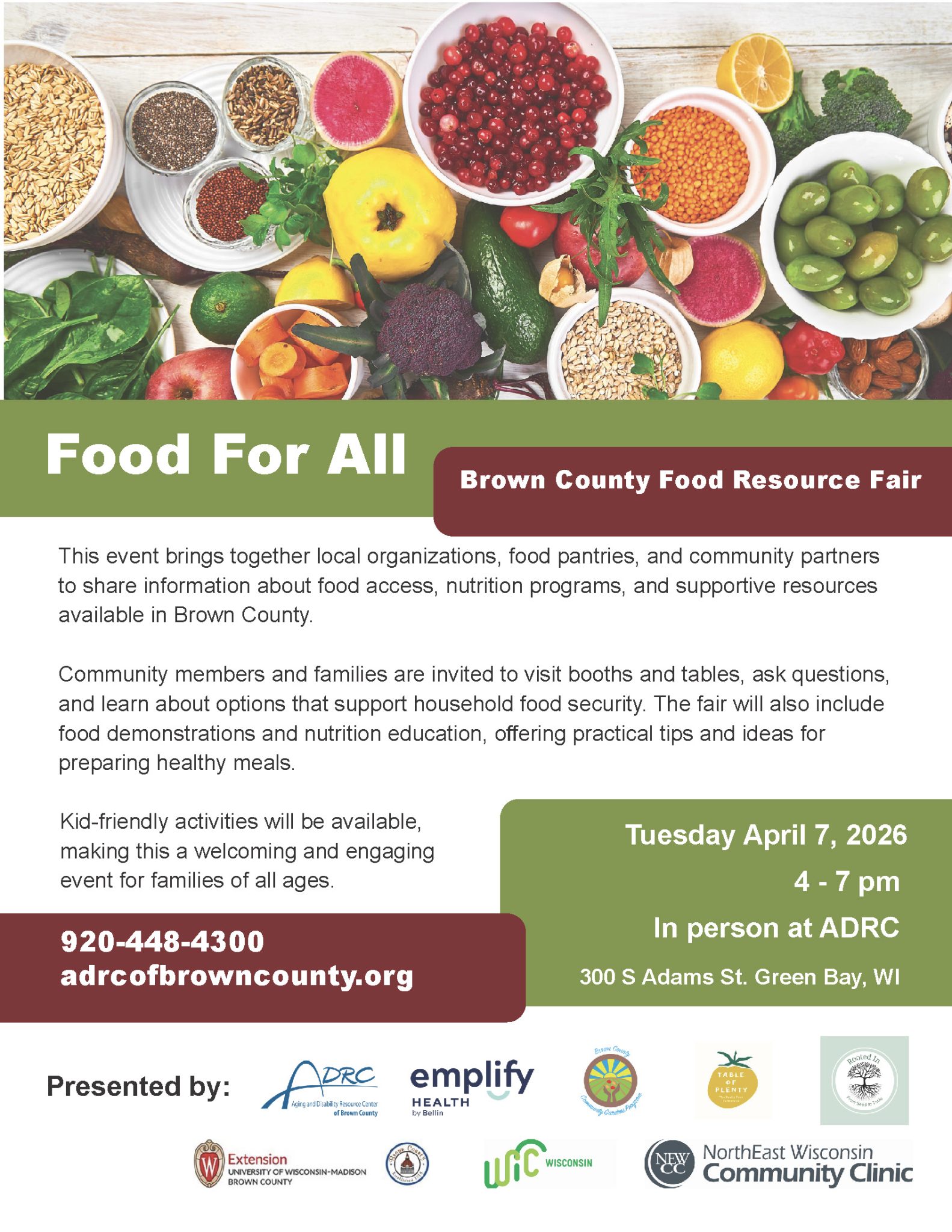 You are invited to join us and share the attached poster for the Food For All: Brown County Resource Fair on Tuesday, April 7, 2026, from 4–7 PM at the ADRC, 300 S Adams St, Green Bay for a community-focused event that brings food access and nutrition resources together in one place! This free event connects families and community members with local organizations, food pantries, and partners who provide programs and support for household food security.