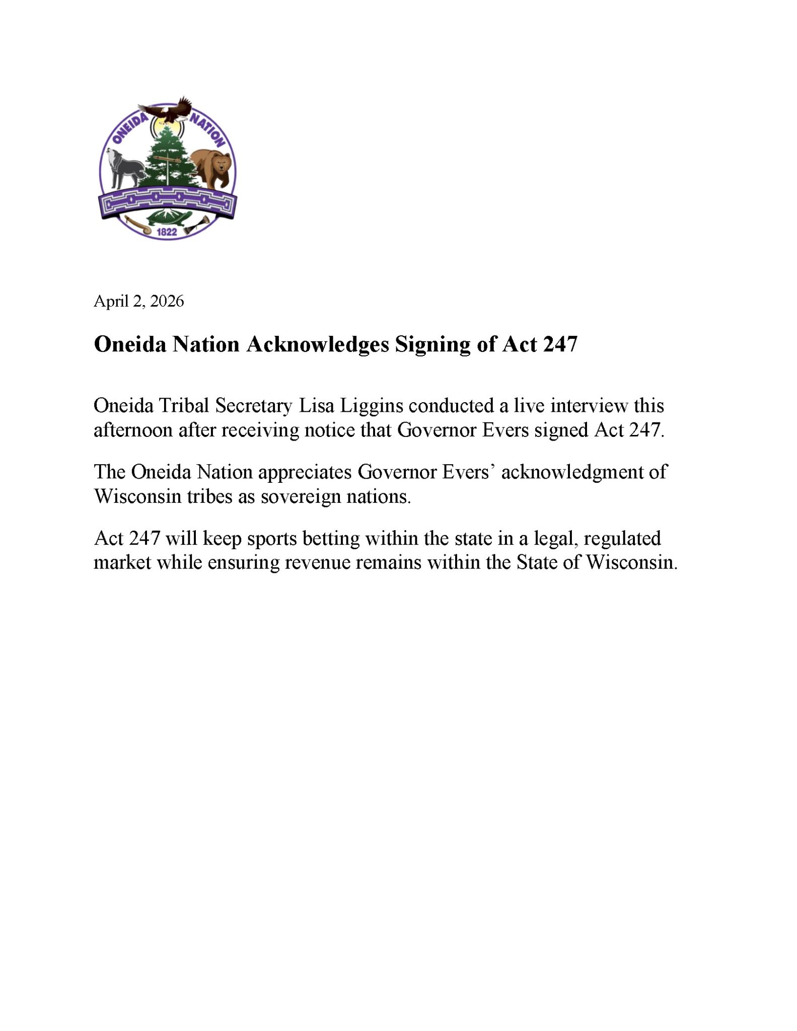 Oneida Nation Acknowledges Signing of Act 247 Posted on Apr 9, 2026 The Oneida Nation issued this official statement following the signing of Act 247: Share Article
