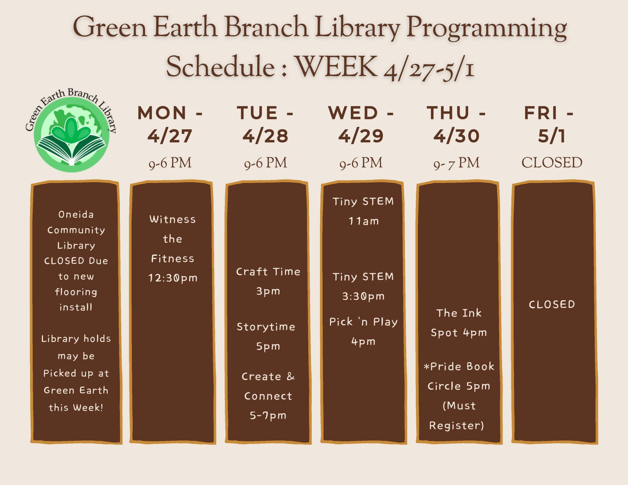 The Oneida Community Library will be closed from April 24th – May 4th. We will be back on May 5th at our usual hours for both locations. Hour Change for Green Earth: Mon- Wed 9-6PM & Thurs. 9-7PM during the Main Library Closure.