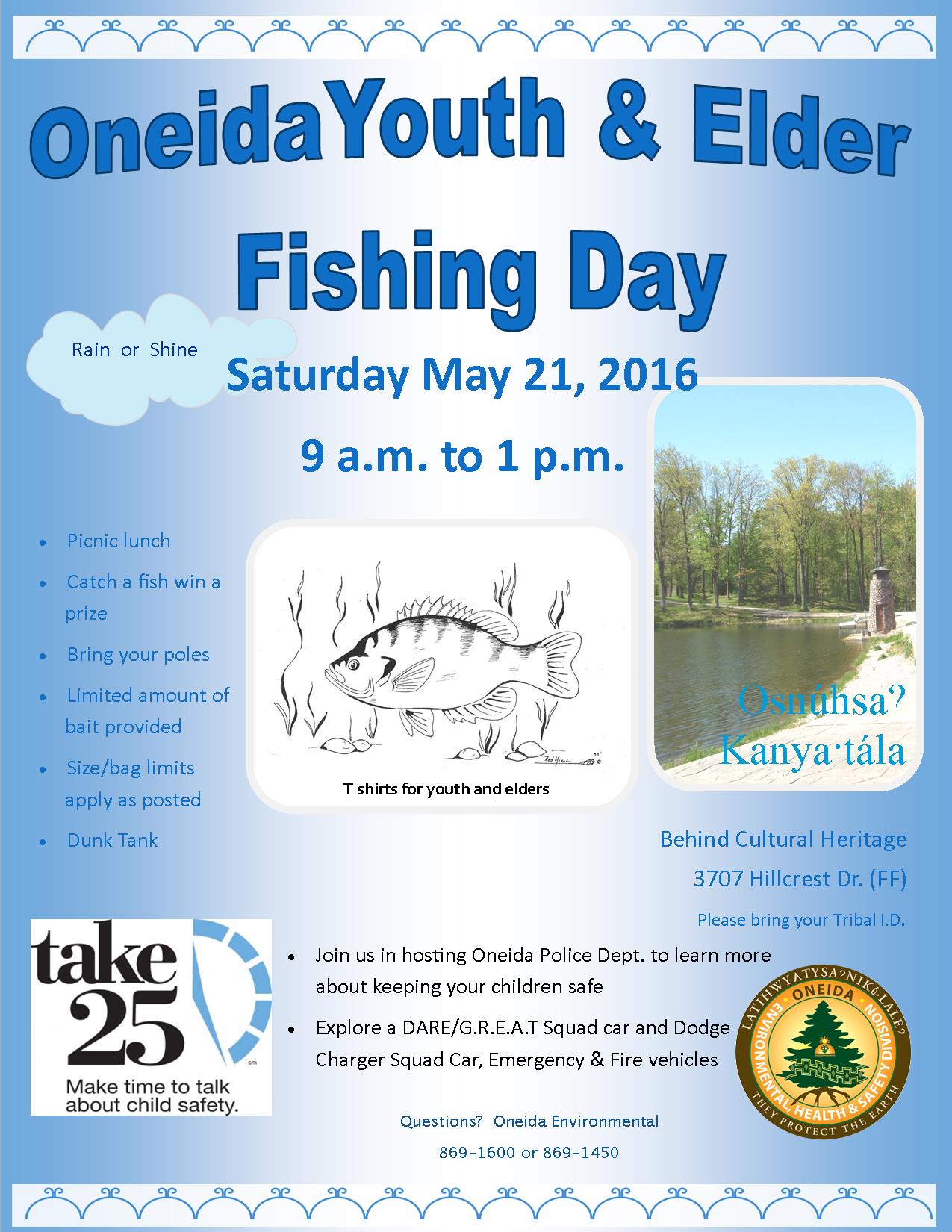 Join EHSD from 9 a.m. to 1 p.m. for our annual Youth & Elder Fishing Day at Osnuhsa Kanyatala. (Finger Lake) behind the Cultural Heritage Building. Bait provided, bring your own fishing poles, we will have a limited amount to check out to use. Oneida Police Department will have a variety of emergency vehicles on site for youth to check out, meet local law enforcement and give parents time to “take 25 minutes to talk to children about safety”.