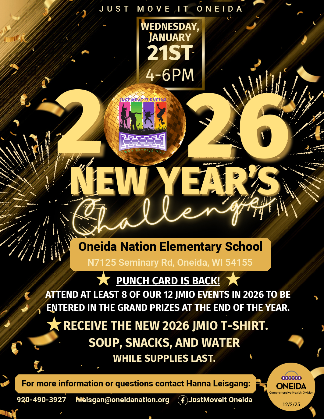 Category: Recreation/Wellness JMIO New Year's Challenge Posted on Jan 7, 2026 by Nate Wisneski Recreation/Wellness January 21, 2026 4:00 pm - 6:00 pm Host: Nate Wisneski Oneida Nation Elementary School N7125 Seminary Rd, Oneida, WI 54155View LocationMap Oneida Nation Elementary School Share Article