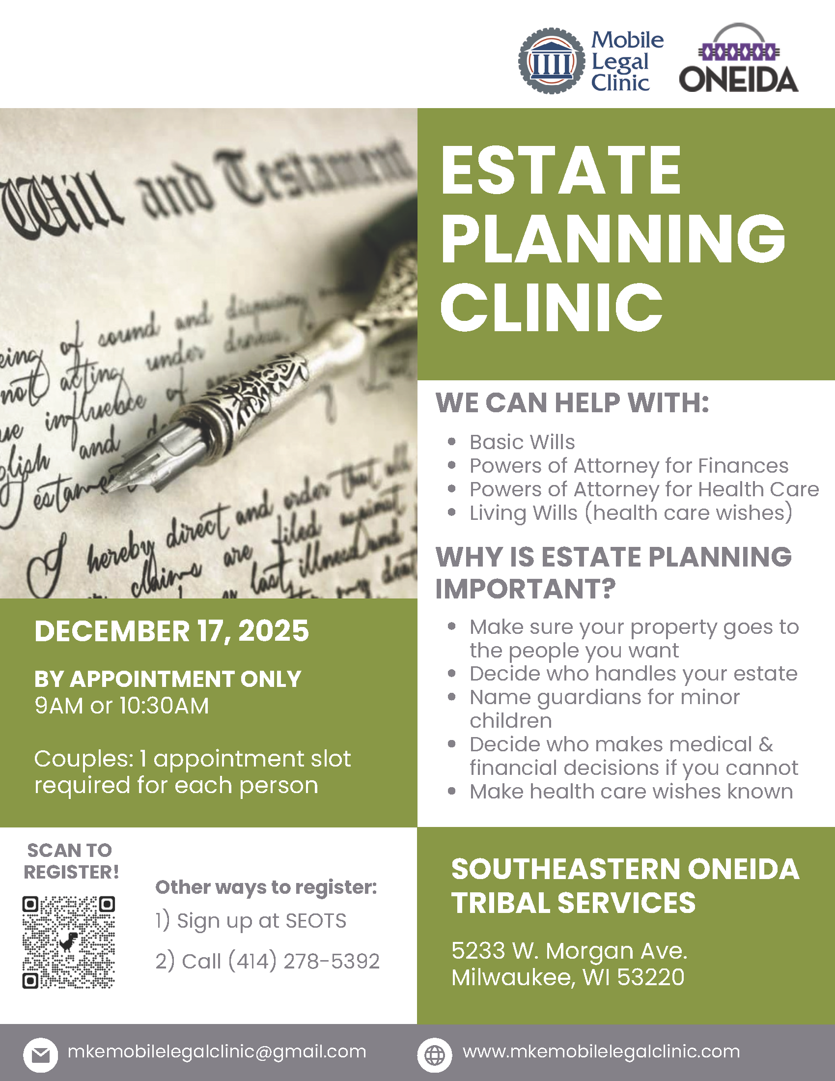 Limited spots available for free estate planning at SEOTS. Must sign up online here: https://waitwhile.com/locations/mvlcmjcappointments/time?registration=booking&service=cbPskQHseSBQ36z6EWJi or call SEOTS to sign up at 414-329-4101. Couples must sign up for both a 9am AND 10:30am spot together.