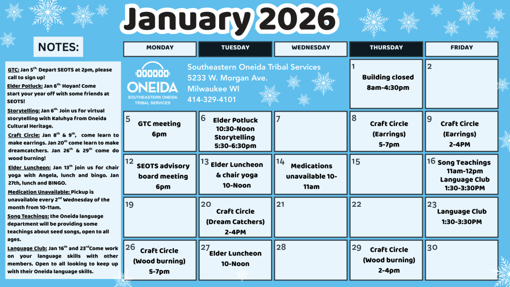 | Song Teachings | Join us for song teachings provided by the Oneida Nation Language Department! | January 16th 11am-12pm |