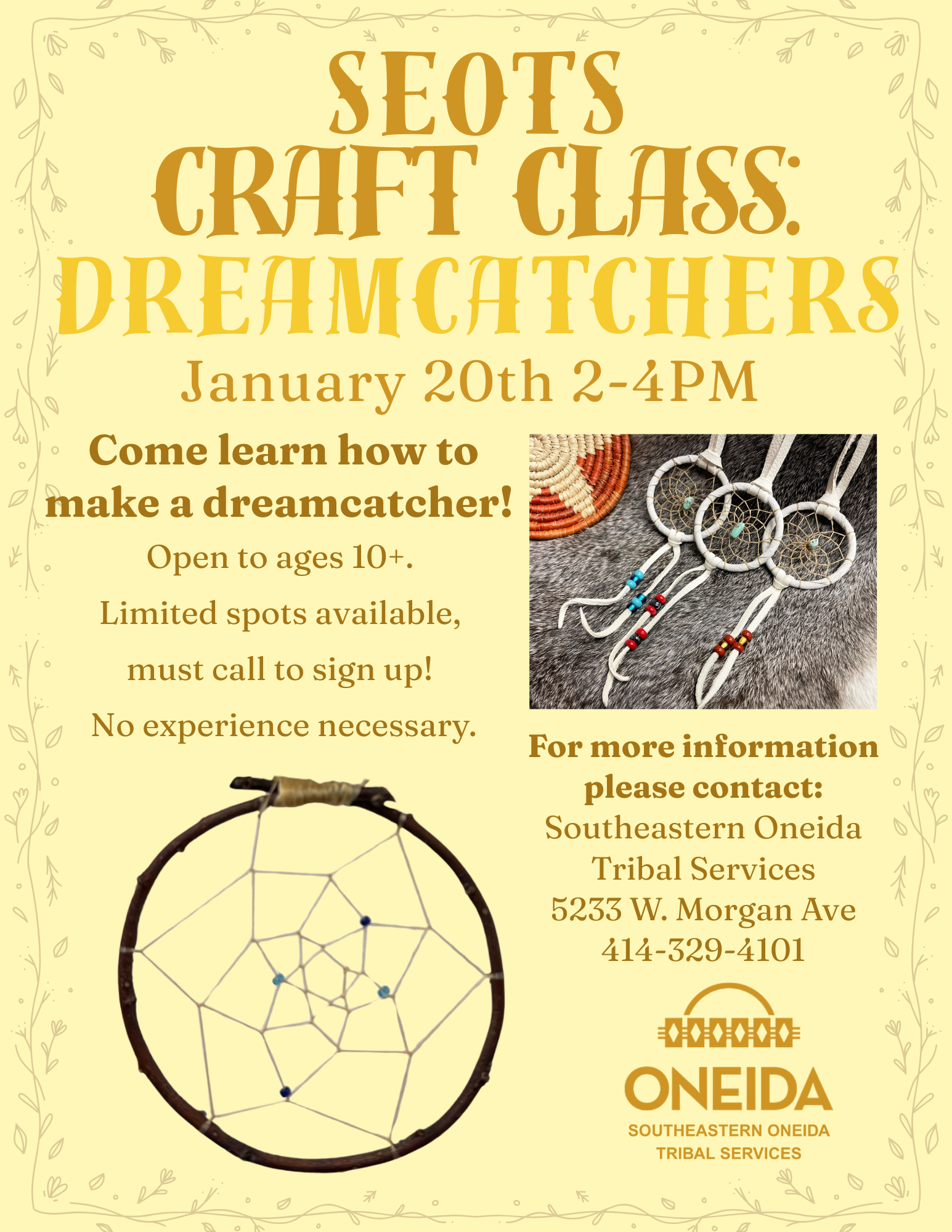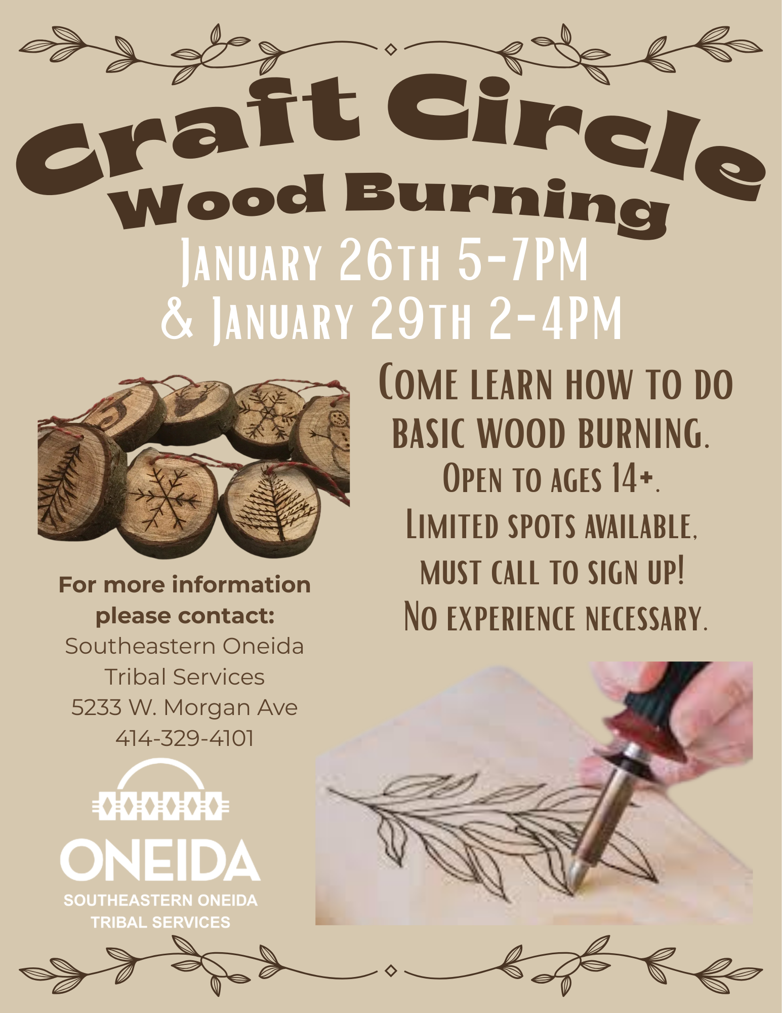 | Craft Circles- Earrings, Wood burning, and Dreamcatchers! | Jan 8th & 9th, come learn to make earrings. Jan 20th come learn to make dreamcatchers. Jan 26th & 29th come do wood burning! | January 8th 5-7pm, January 9th 2-4pm, January 20th 2-4pm, January 26th 5-7pm, and January 29th 2-4pm. | |