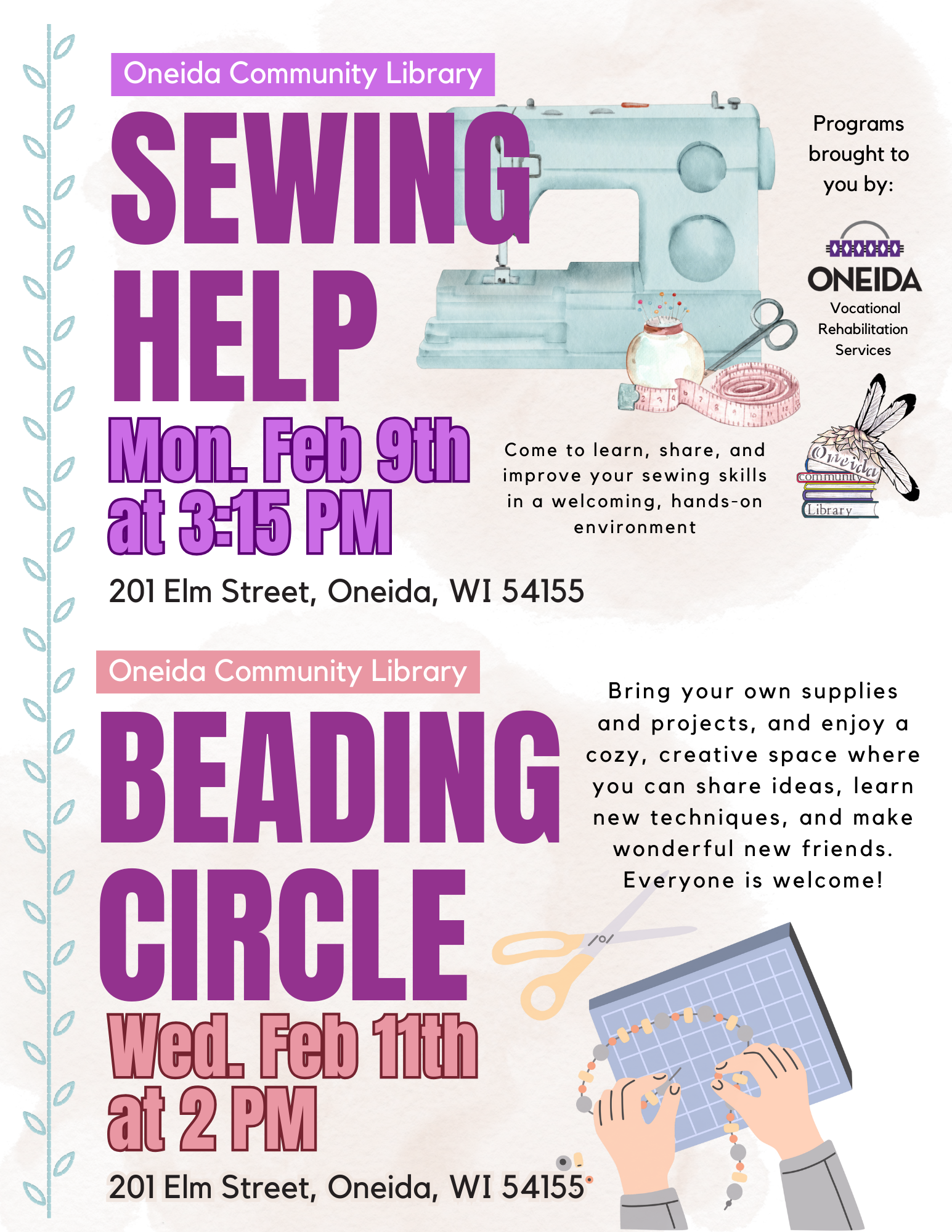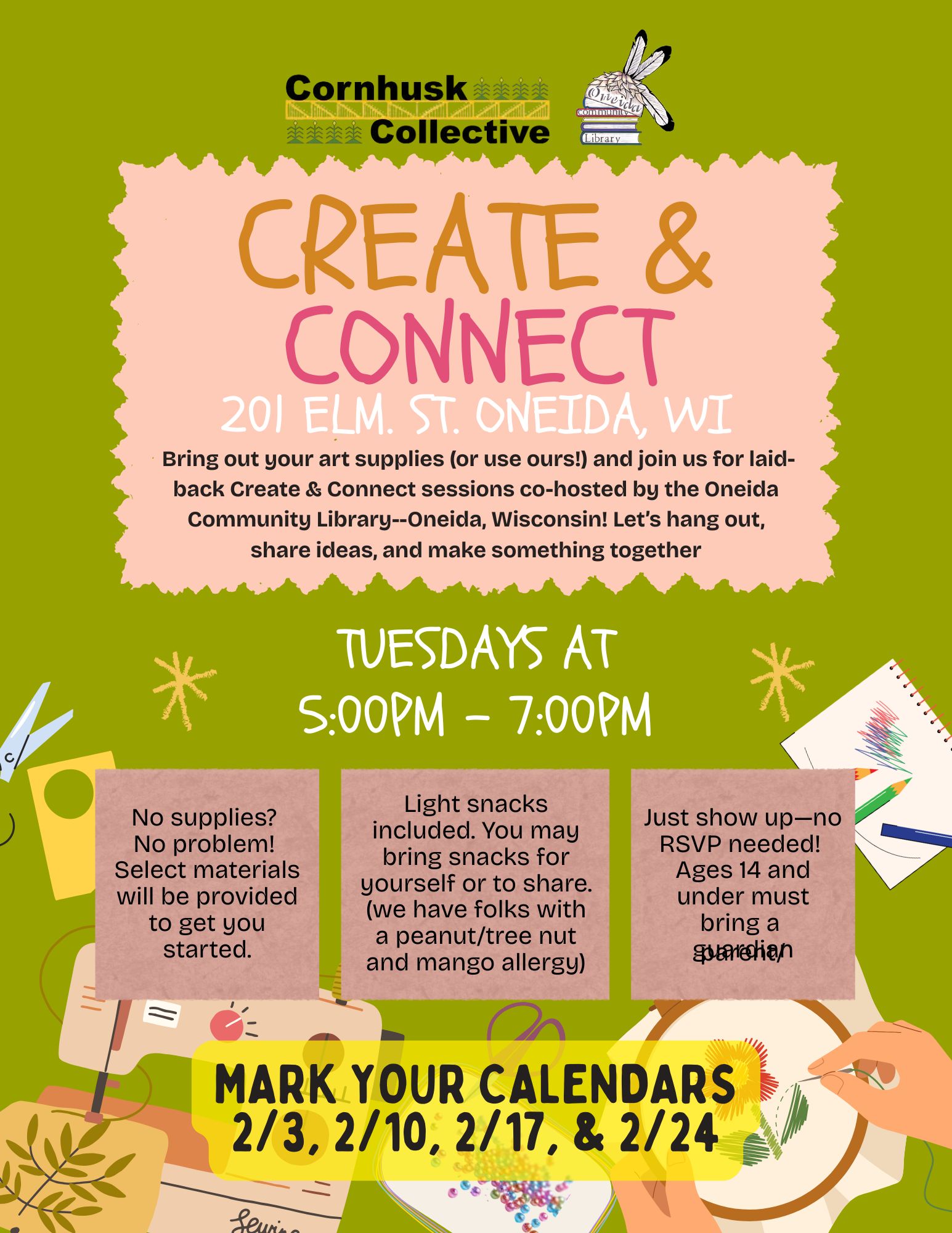 Bring out your art supplies (or use ours!) and join us for laid-back Create & Connect sessions co-hosted by the Oneida Community Library–Oneida, Wisconsin! Let’s hang out, share ideas, and make something together
