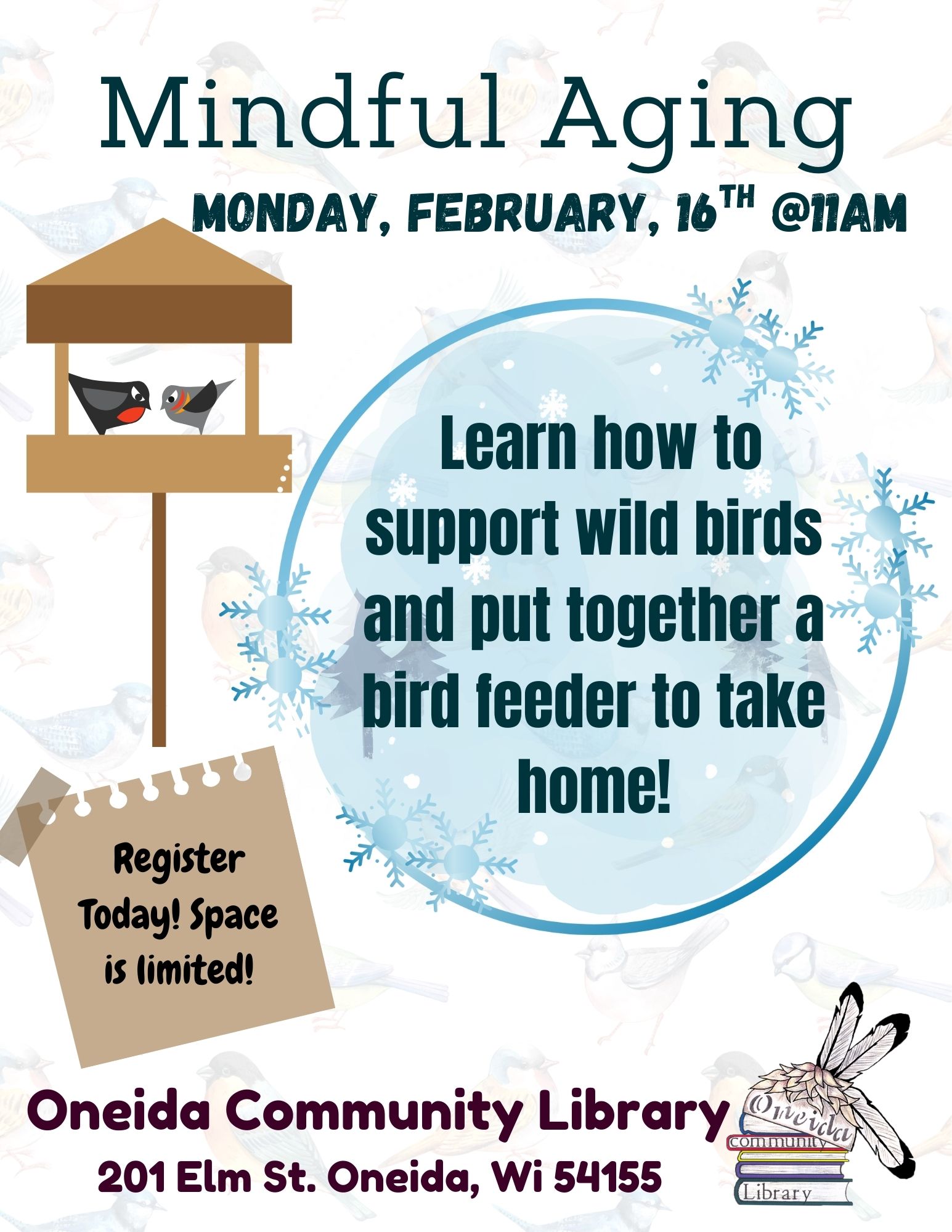 Join us for Mindful Aging: Heart Awareness! Our Library health guests, Taylor & Maria will share resources and info on basic heart health. We’ll be meeting on Monday, February 2 at 11 AM. Yaw^ko to our friends at Oneida Health Promotion for helping us.