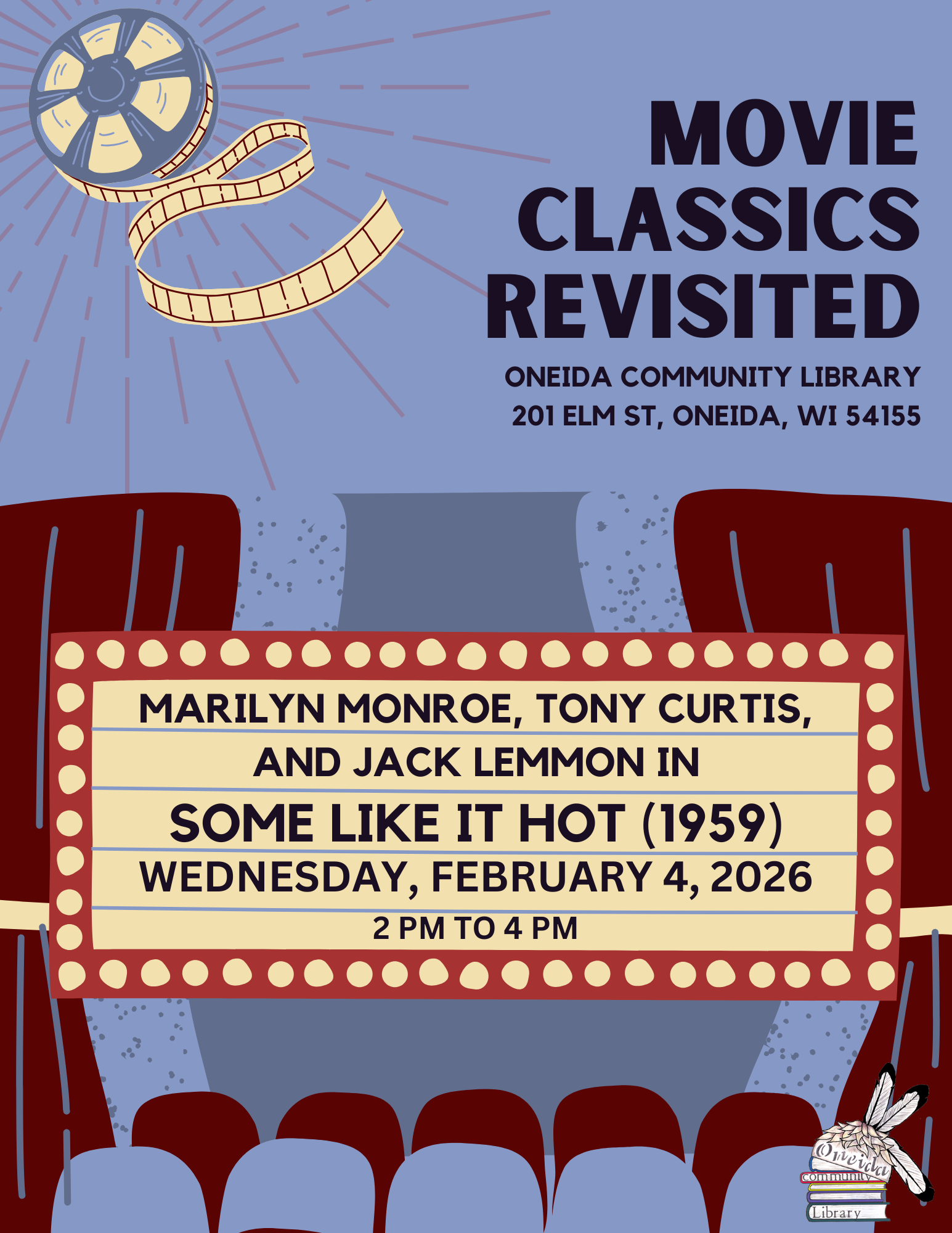 A club for classic movie enthusiasts to watch films and discuss. This month, we’ll be discussing “Some Like It Hot” starring Marilyn Monroe, Tony Curtis, and Jack Lemmon.