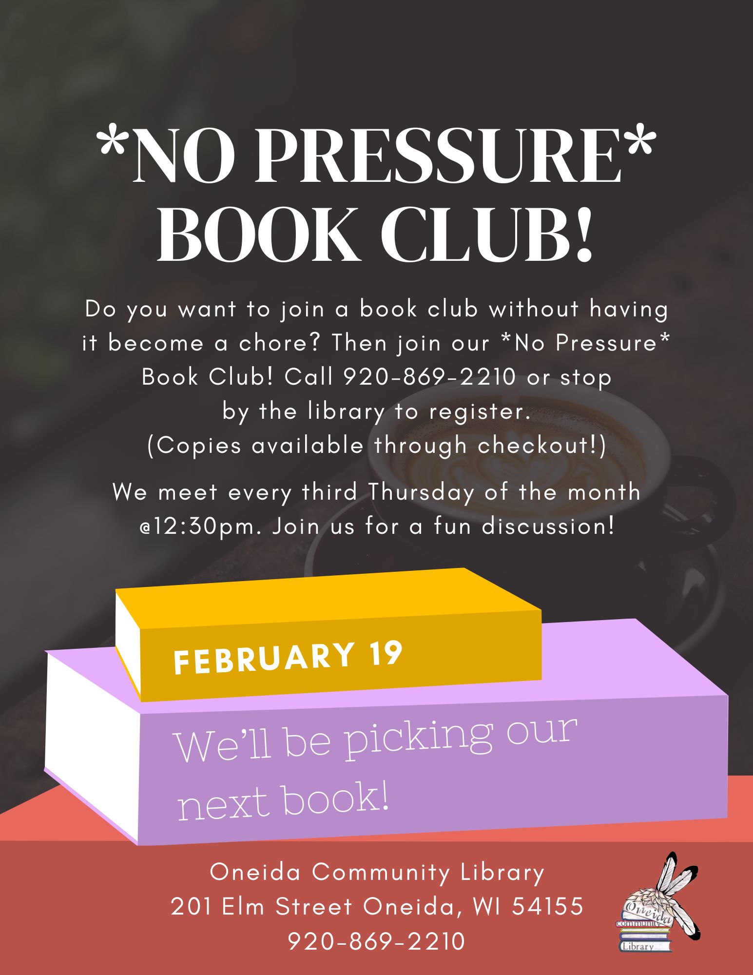 Do you want to join a book club without having it become a chore? Then join our *No Pressure* Book Club! Call 920-869-2210 or stop by the library to register.(Copies available through checkout!) We’ll be picking our next book!