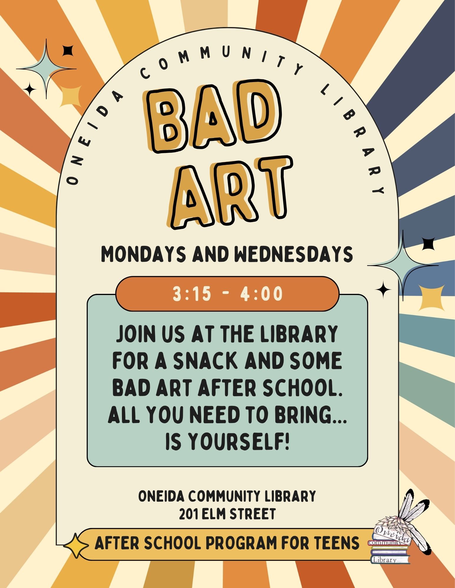 Join us at the library for a snack and some bad art after school. all you need to bring… is yourself! After school program for teens. Mondays and Wednesdays.