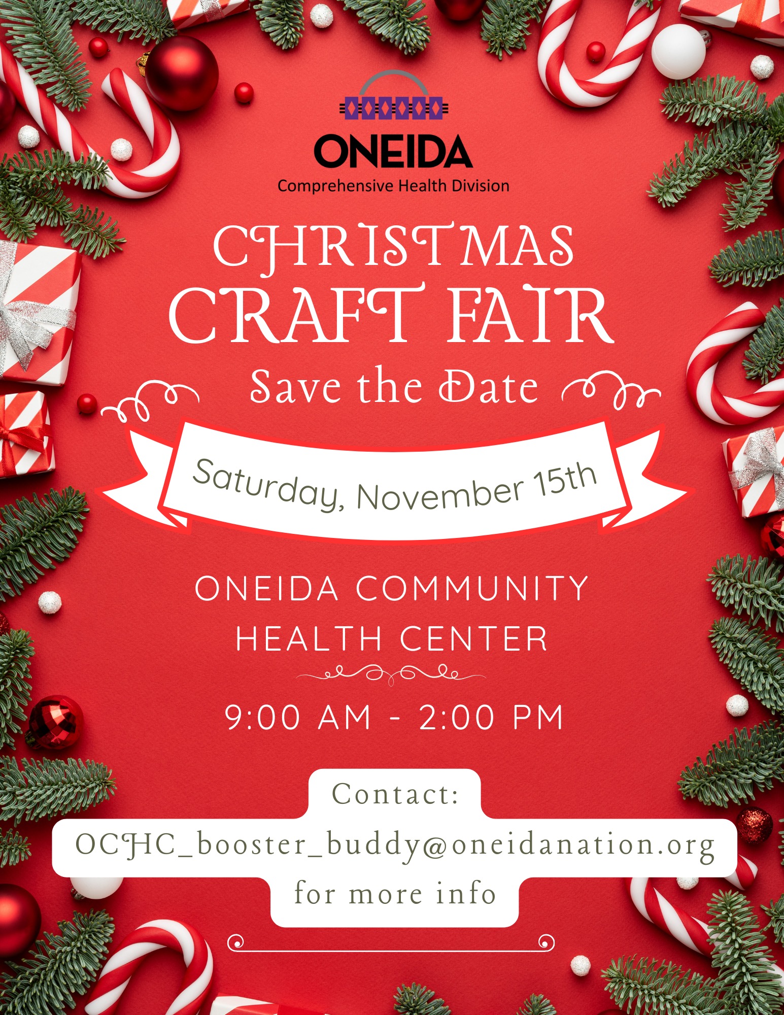 Join us for the return of the OCHD Christmas Craft Fair! Have a jolly good time on Saturday, November 15, from 9 a.m. until 2 p.m. at Oneida Community Health Center. Vendors are still being accepted for the event. View the event’s flyer here. Contact ochc_booster_buddy@oneidanation.org for more information.
