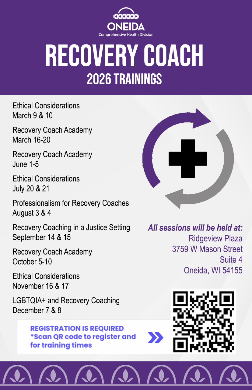 The meetings listed above are held at the Oneida Recovery Nest, 1240 Packerland Drive #2 in Green Bay. For more information, please call: (920) 490-3950 or email RecoveryCoach@oneidanation.org.
