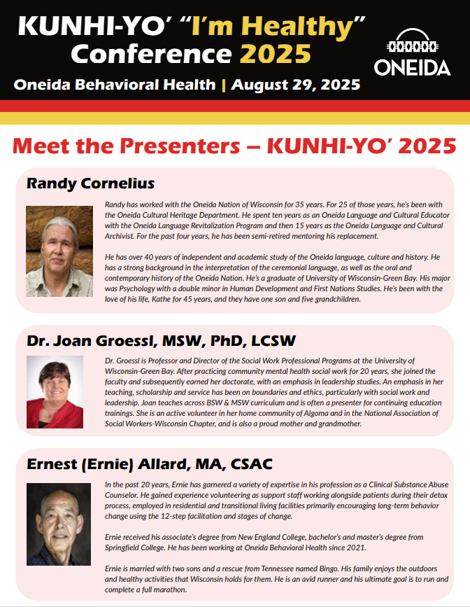 Oneida Nation community members are invited to the free KUNHI-YO’ “I’m Healthy” conference on Friday, August 29, 2025, at the Oneida Hotel & Conference Center. The event, sponsored by Oneida Behavioral Health’s Tribal Opioid Response Team, coincides with International Overdose Awareness Day.