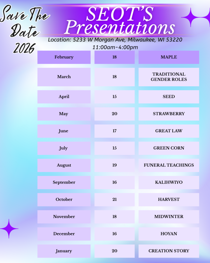 | Virtual Storytelling with Kaluhya | Jan 6th. Join us for virtual storytelling at SEOTS with Kaluhya from Oneida Cultural Heritage. | January 6th 5:30-6:30pm | Click here to view flyer |